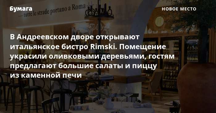 Гастрономический кластер на территории Андреевского двора пополнил еще один проект — итальянское бистро Rimski от ресторанной группы «Комитет», сообщили «Бумаге» представители заведения.