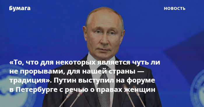 Путин также сказал, что женщины играют всё более весомую роль в решении стоящих перед миром задач и что они не должны оказываться перед выбором «либо дети, семья, либо собственная профессиональная реализация». Поэтому, по его словам, в России создают условия, чтобы «женщина после рождения ребенка могла в любой момент начать или возобновить свою профессиональную карьеру».
