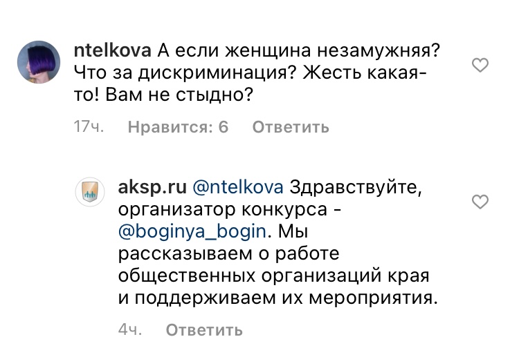 "А если женщина незамужняя? Что за дискриминация? Жесть какая-то! Вам не стыдно?" Жительница Барнаула Татьяна Гейнрих добавила: "Матери-одиночки и разведенные, судя по вашему посту, – второй сорт".