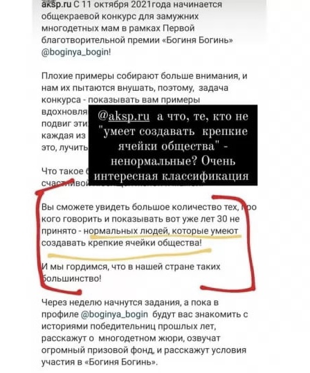 Организаторы конкурса заявили, что в нем могут принять участие только замужние многодетные мамы. В посте Минсоцзащиты их назвали "нормальными" людьми, которые умеют создавать крепкие ячейки общества. Пользовательниц сети возмутило, что такая формулировка предполагает, что незамужние женщины без детей якобы ненормальны.