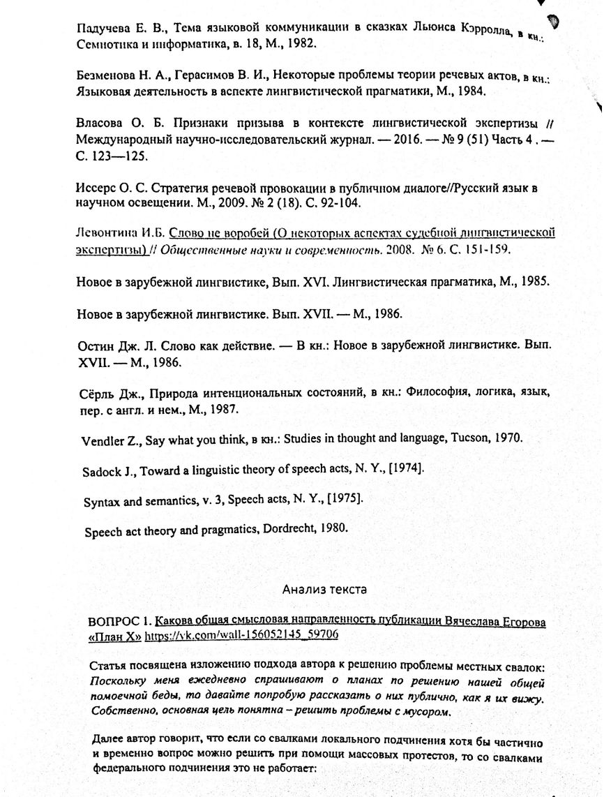 Позже в суде защита Егорова доказывала, что в своей статье он не призывал людей выйти на несанкционированный митинг. В материалах уголовного дела есть результат лингвистического заключения, которое сделала по просьбе защиты ведущий научный сотрудник Сектора теоретической семантики Федерального государственного бюджетного учреждения Институт русского языка имени В. В. Виноградова Ирина Левонтина. Эксперт пришла к выводу, что статья Егорова не содержит призывов к каким-либо определенным действиям, там есть лишь вывод, что единственный способ бороться со свалками — это участие в выборах. Участие в каких-либо массовых мероприятиях в этот план не входят. Текст лингвистической экспертизы есть в распоряжении The Insider.