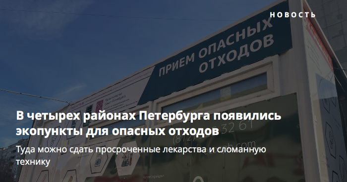 Теперь жители Красносельского, Колпинского, Василеостровского и Невского районов могут бесплатно сдать автомобильные покрышки, бытовую химию, просроченные лекарства и отработанные масла, а также вышедшую из строя бытовую, электронную, компьютерную и оргтехнику. Адреса экопунктов можно посмотреть по этой ссылке.