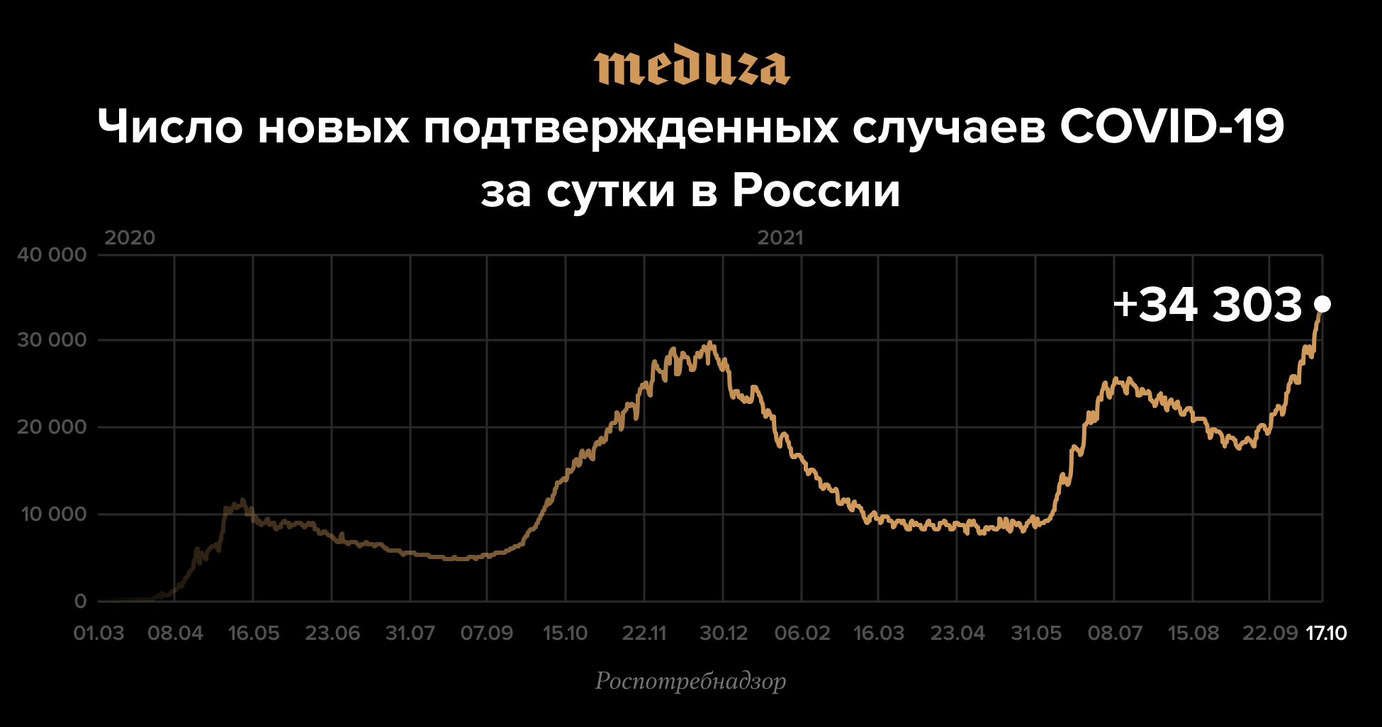В России новый антирекорд по числу заболевших COVID-19 — 34 303 случая за сутки
