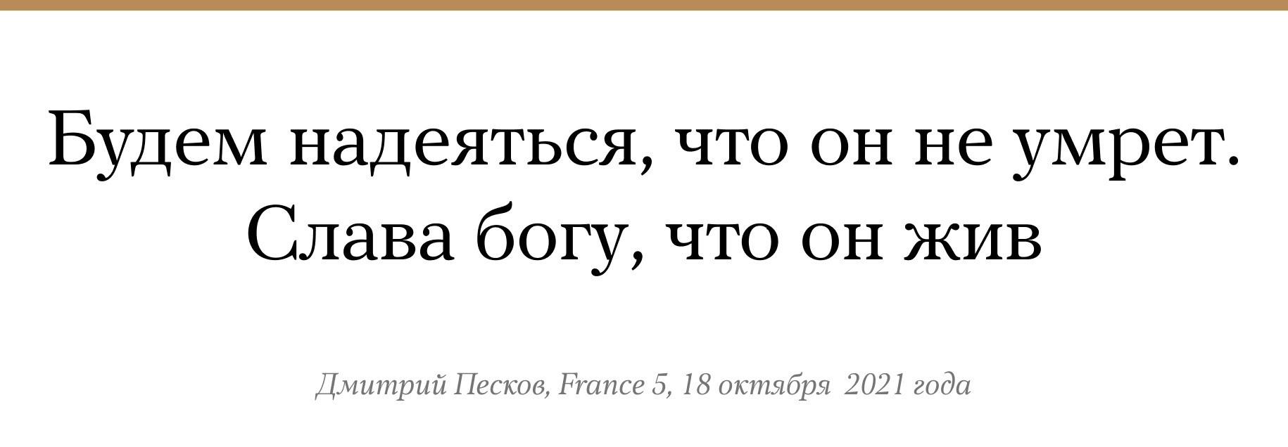 Пресс-секретарь президента РФ Дмитрий Песков выразил надежду на то, что политик Алексей Навальный не умрет в исправительной колонии, где он отбывает срок по делу «Ив Роше». Об этом представитель Кремля заявил в интервью для документального фильма «Путин: мастер игры» (Poutine, le maître du jeu) французского телеканала France 5. На вопрос, не побаивается ли российская власть Алексея Навального, Песков ответил отрицательно, добавив, что Кремль отказывается называть оппозиционера по имени, потому что не хочет делиться с ним своей популярностью.