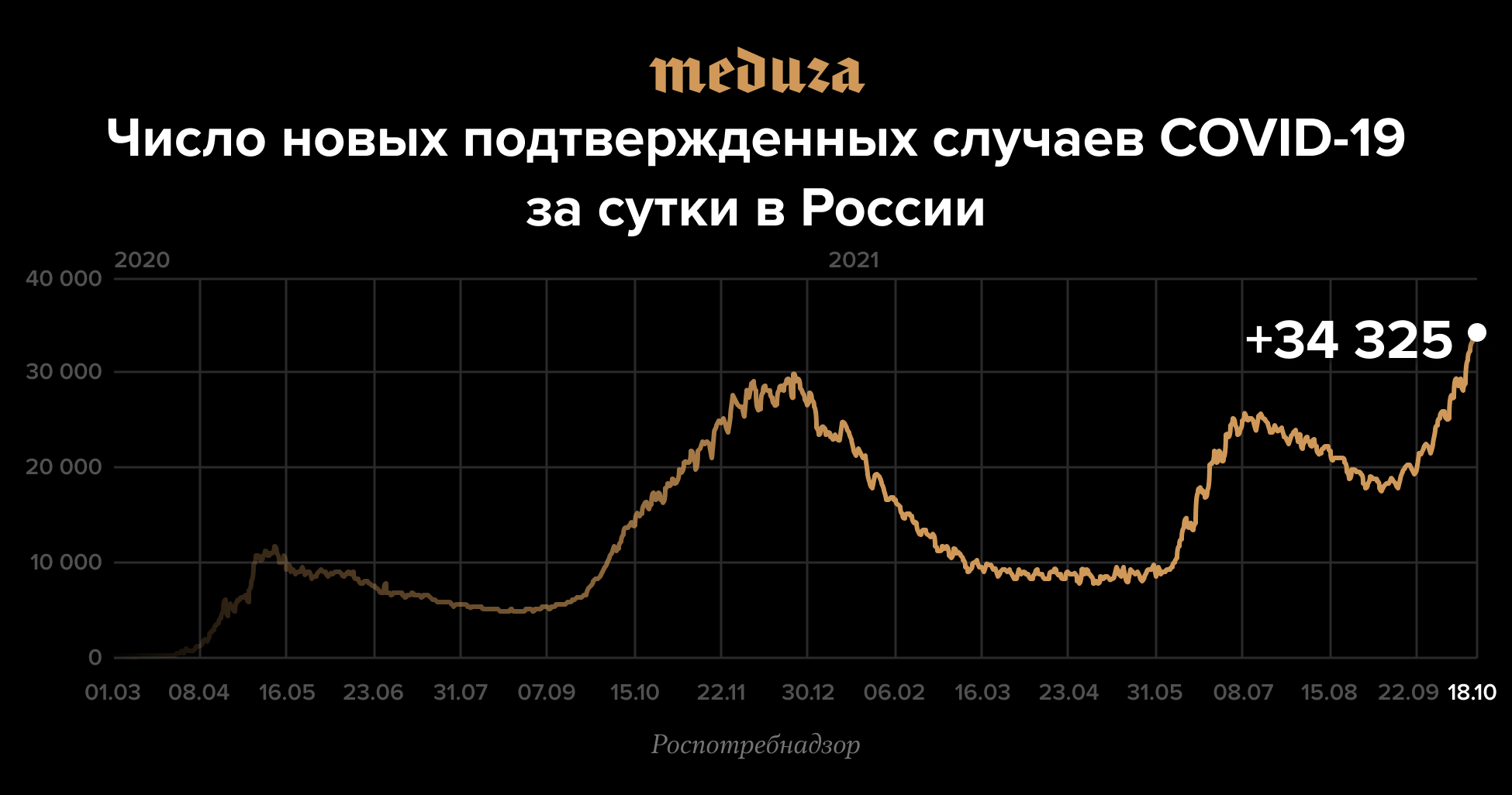 В России за прошедшие сутки выявлено 34 325 новых случаев COVID-19, сообщил федеральный оперативный штаб 18 октября. Это — максимальная суточная заболеваемость с начала пандемии. Более 34 тысяч заболевших за сутки фиксируют в России второй день подряд.