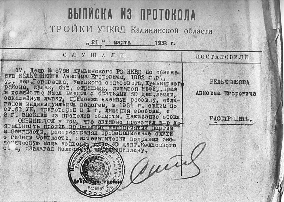 «Бельченков Анисим Егорович 1882 года рождения, беспартийный, грамотный, по национальности русский, гр-н СССР из крестьян КУЛАКОВ дер. Гороватка Ушицкого с/сов., имевший в х-ве с отцом 60 десятин купленной земли, 3 лошади, 10 коров, бакалейную лавку, шерсточесалку, применялась наемная рабочая сила, х-во облагалось индивидуальным налогом, лишался избирательных прав. В царское время служил в полиции стражником.