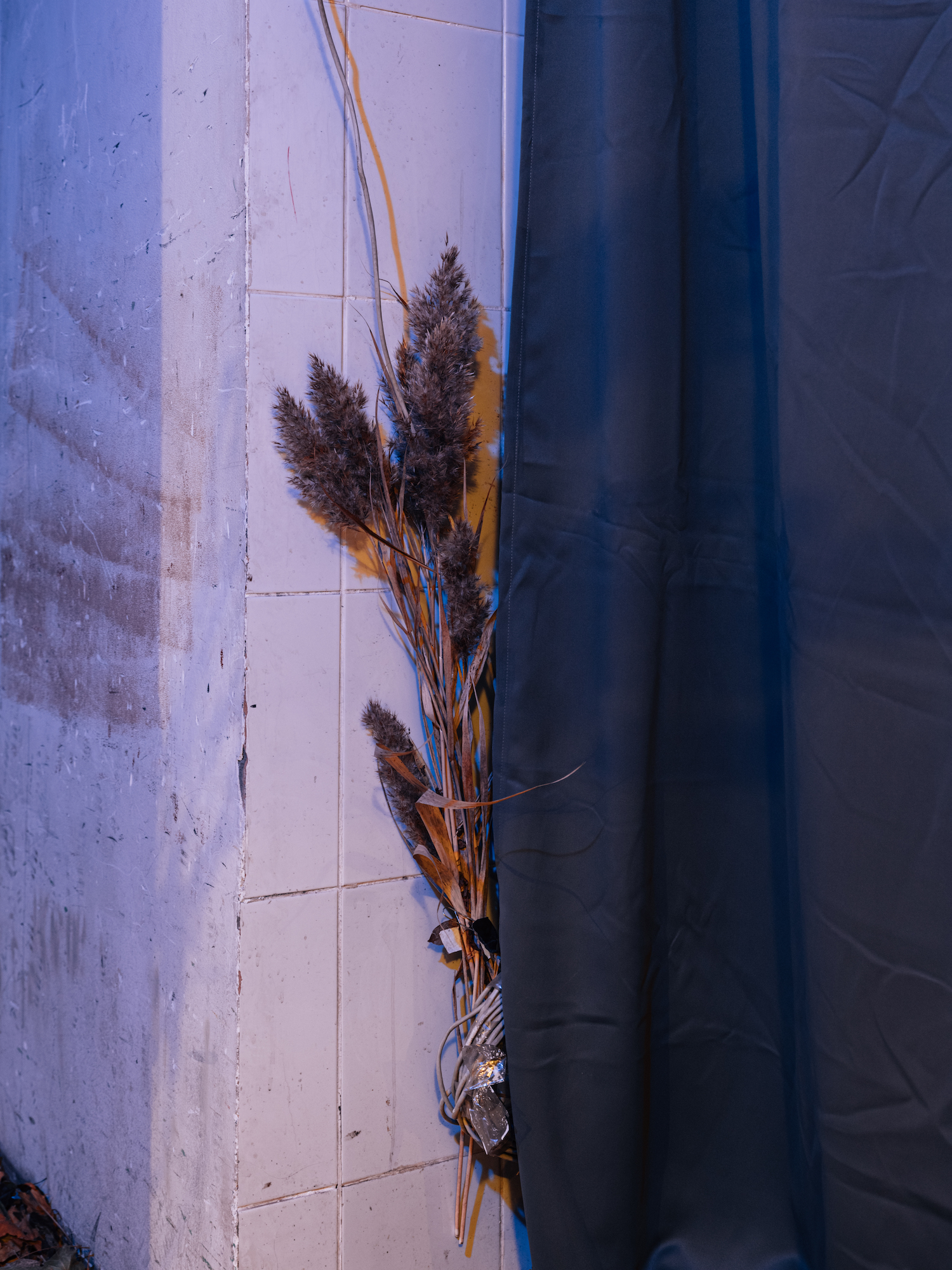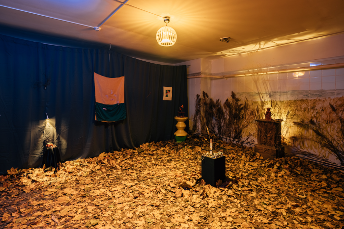 В служебном помещении «Лавки художника» на Невском проспекте, 8 проходит «Тайная выставка». Пол небольшого пространства застелен настоящей опавшей листвой — для этого понадобилось восемь мешков листьев. Стены декорированы тростником.