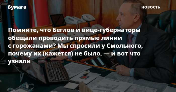 Помните, что Беглов и вице-губернаторы обещали проводить прямые линии с горожанами? Мы спросили у Смольного, почему их (кажется) не было, — и вот что узнали