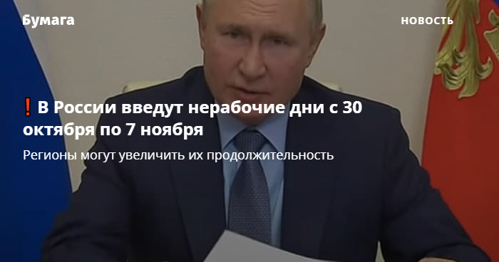 ❗️ В России ввели нерабочие дни с 30 октября по 7 ноября. Регионы могут увеличить их продолжительность