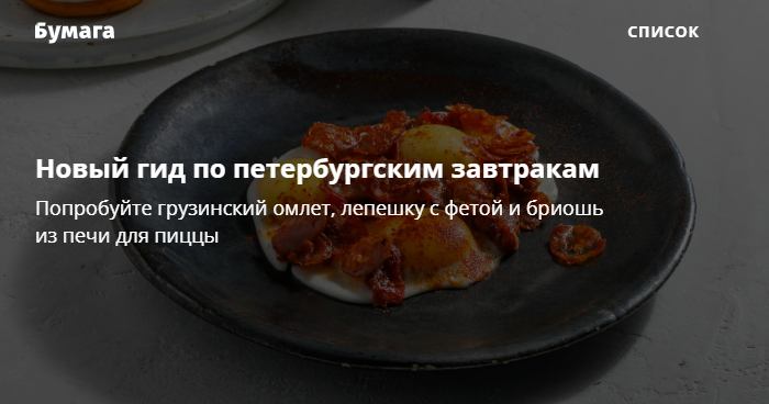 В январе 2021 года «Бумага» выбрала 15 мест с хорошими завтраками: практически все рекомендации из того материала актуальны и сегодня. В продолжении нашего гида — открытия 2021 года и заведения, запустившие завтраки относительно недавно.