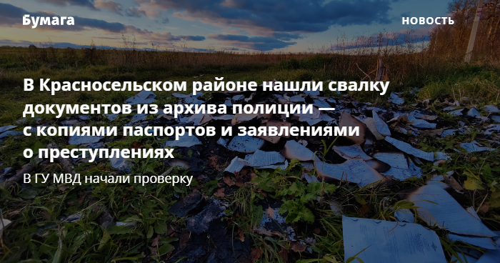 В ГУ МВД Петербурга и Ленобласти «Бумаге» сообщили, что документы относились к архиву 2013–2015 годов и по сроку подлежали уничтожению. Но эта процедура была выполнена «некачественно». «Оставшиеся документы оперативно были изъяты и уничтожены. По факту инцидента проводится служебная проверка», — отметили в ГУ МВД.