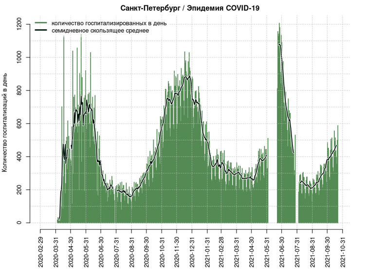 Согласно подсчетам Куприянова на основе официальных данных о госпитализациях, в Петербурге за последнюю неделю отправили в больницы 3277 человек. Это на 9,7 % больше, чем за предыдущие семь дней. Для сравнения: за семь дней в конце августа в петербургские больницы отправили 1477 человек с коронавирусом или пневмониями. На пиках второй и третьей волн в Петербурге госпитализировали по 1000 человек ежедневно.