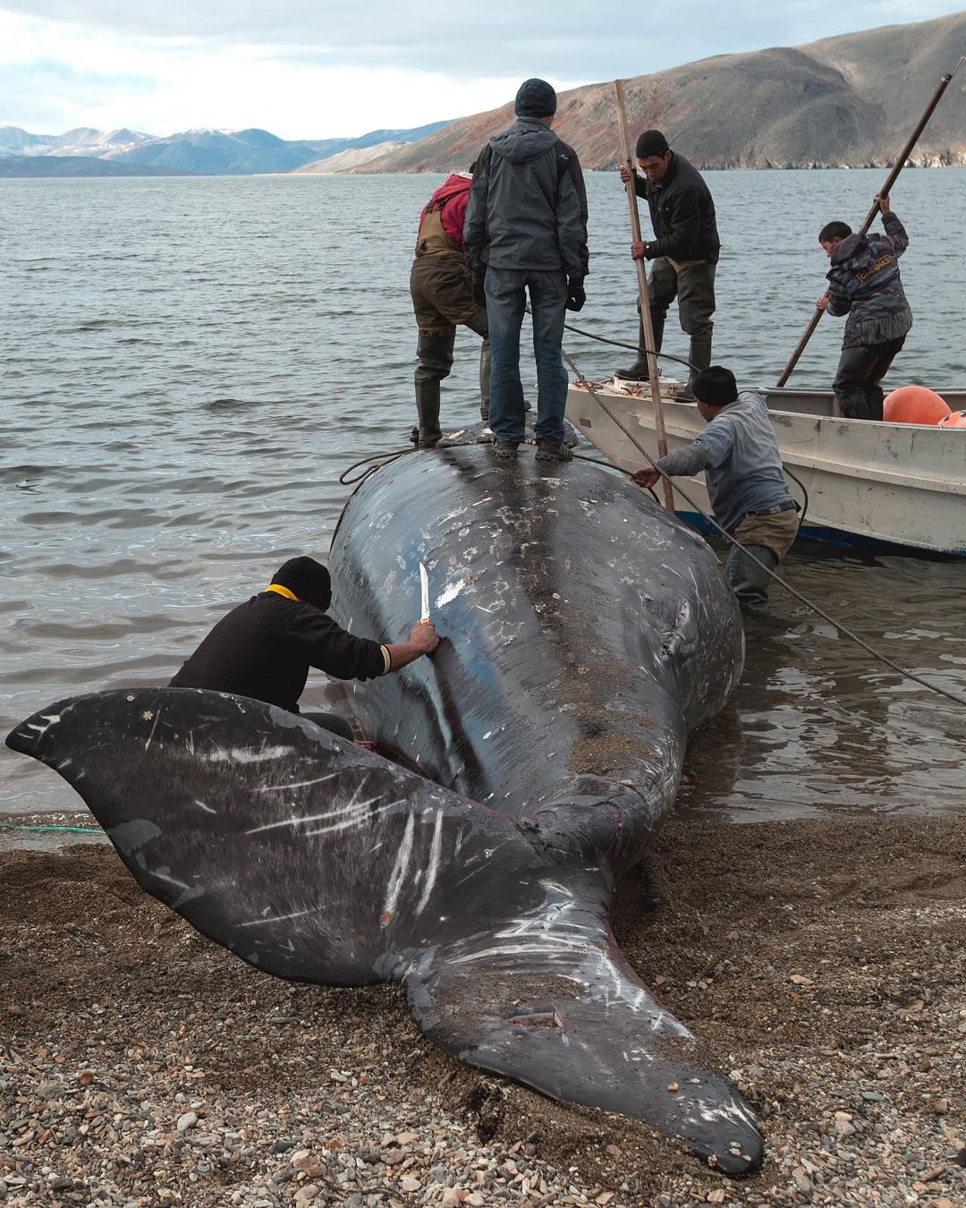 – Те, кто хотя бы небольшое представление о каякинге имеет, о нем слышали. От большой волны, вызванной ударом гигантской туши кита о воду, байдару могло разнести в клочья. Поэтому охотники сами переворачивали лодку резким движением тела и уходили от волны под воду. Выполняли тот же маневр в толще воды и возвращались в исходное положение. Надо ли говорить, что водичка была не приятной комнатной температуры? – рассказывает Соколова. – Вот на этом фото из-за ракурса серый кит кажется раза в три меньше, чем на самом деле. Его средний вес при этом 27 000 кило. Когда я представляю гренландского кита, средний вес которого 120 000 кило, не понимаю, как эскимосы не умирали от ужаса, выходя на него в море на малюсеньких байдарках. Мясо они добывают только для своих нужд, не продают. Но сколько этой туши им хватит на общину – не сказали.