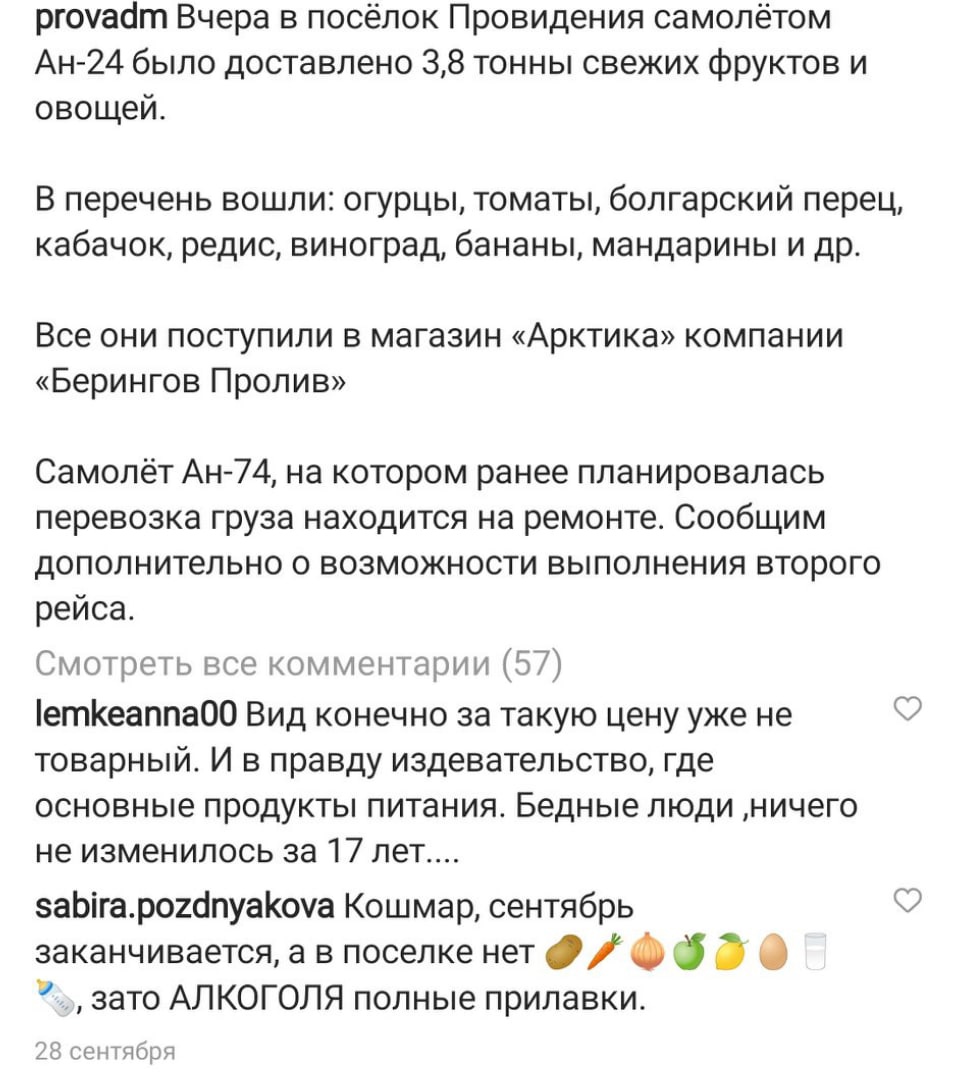 – Из овощей только картофель остался, молочной продукции нет вообще! – говорит ее дочь Валентина Ходак. – За всю навигацию был только один корабль. Хотя обычно их 4–5 в сезон. Нам все обещают вертолет из Эгвекинота – он должен доставить 2 тонны продуктов. Но его прилет постоянно переносят – нелетная погода. Недавно авиация завезла 4 тонны продуктов. Но из-за того, что это по воздуху, цены просто заоблачные. Это при том, что власти часть затрат перевозчикам компенсируют, и все равно выходит очень дорого для нас. Именно поэтому никогда в период навигации авиацией не доставлялись продукты.