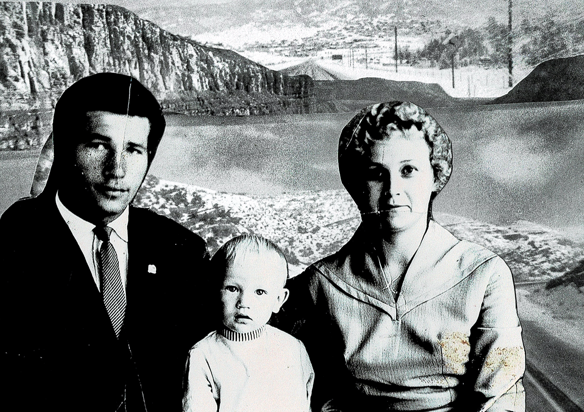 Семейный портрет отца с родителями. На фоне — коллаж из нескольких дорожных фотографий, сделанных папой