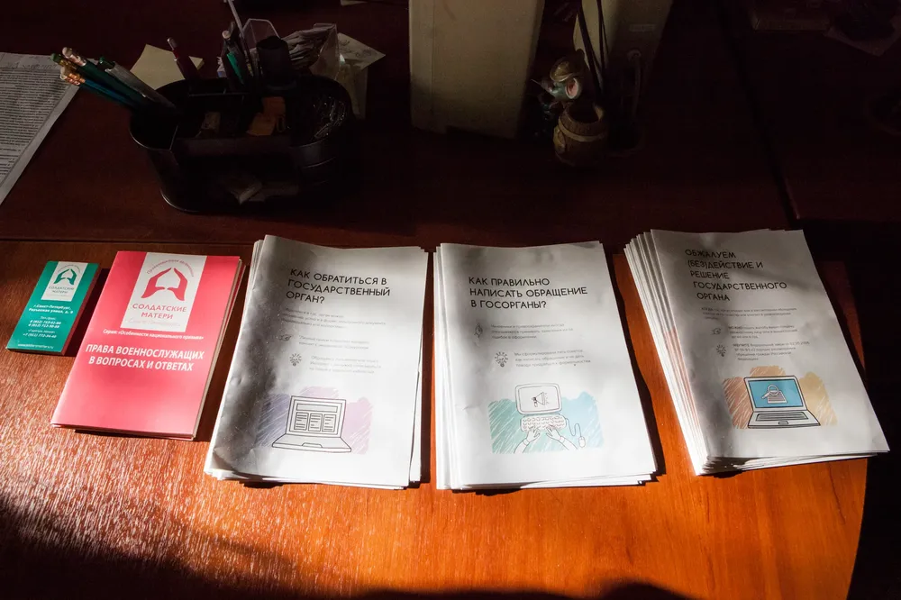 Офис правозащитной организации «Солдатские матери СПб» расположен в особняке купца Петухова — эклектичном здании, построенном еще в 1872 году. Сейчас на входной двери особняка висит яркая табличка клининговой компании, и табличка поменьше — с информацией о «Солдатских матерях СПб». Придя в середине буднего дня, в офисе мы застали лишь пятерых сотрудников: одного из создателей организации, двух юристов, пресс-секретаря и бухгалтера. В штате официально числятся и вовсе два человека, все остальные работают здесь в качестве волонтеров.