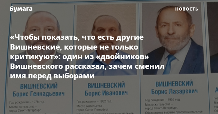 — Меня никто не заставлял [менять свои данные]. Я посчитал, что кроме голословных заявлений кандидатов и критики нашей политической власти, нашего руководства города и района нужно еще и что-то делать. Когда кандидаты в депутаты разного уровня занимаются только критикой, что всё плохо, чем занимается в том числе Вишневский Борис Лазаревич, то для части жителей и меня это неприемлемо. Потому что прежде чем критиковать, нужно что-то предлагать. <…> Поэтому я решение принял поменять свои данные, чтобы показать, что кроме критиков есть еще другие люди, которые могут что-то делать, есть другие Вишневские, условно говоря, которые не только критикуют, но и несут позитив.