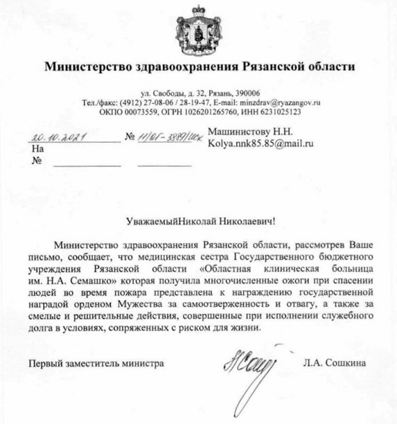 Рязанский общественный деятель казачий полковник Николай Машинистов обратился к президенту России с ходатайством о присвоении звания героя России 27-летней медсестре больницы имени Семашко Елене Фёдоровой. Во время летнего пожара девушка, рискуя жизнью, спасала пациентов.