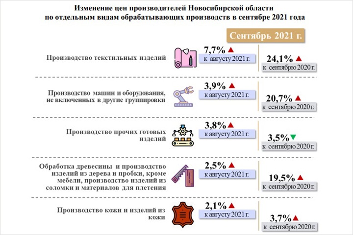 Выпуск текстильных изделий подорожал на 24,1%, машин и оборудования — на 20,7%, обработка древесины, производство изделий из пробки и дерева (кроме мебели) — на 19,5%.