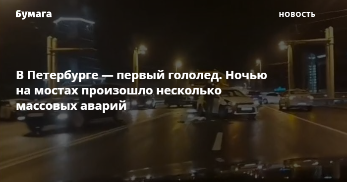 Как сообщили участники группы «ДТП и ЧП» во «ВКонтакте», ночью аварии произошли на Ушаковском, Кантемировском и Дворцовом мостах. На Ушаковском очевидцы насчитали сразу 13 пострадавших автомобилей, на Кантемировском — десять. Около десяти пострадавших машин также видели на мосту Бетанкура.