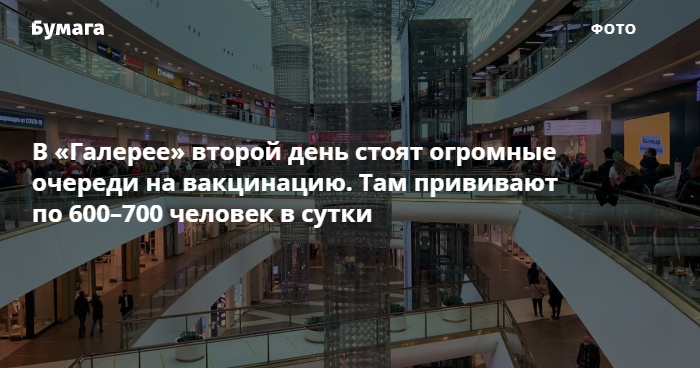 В торговом центре «Галерея» в эти выходные выстраиваются очереди из желающих привиться. Как сообщили «Бумаге» читатели, днем 24 октября цепочка из людей занимала несколько десятков метров в длину.