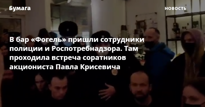 Вечером 24 октября в бар «Фогель» пришли сотрудники полиции и Роспотребнадзора, рассказали «Бумаге» в заведении. В это время там проходил «Вечер писем политзаключенному Павлу Крисевичу».