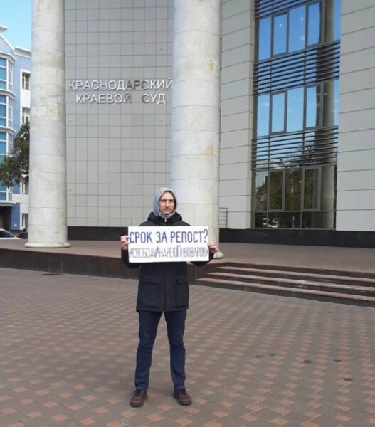 Поддержку Пивоварову в виде одиночного пикета у здания краевого суда оказал один из краснодарских активистов.