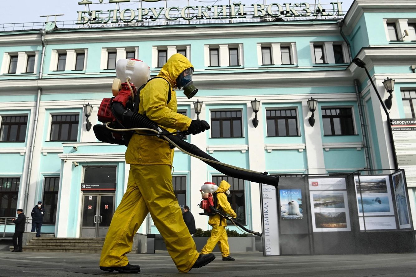 Кирилл Кудрявцев / AFP / Scanpix / LETA Сотрудник МЧС проводит дезинфекцию Белорусского вокзала. Москва, 20 октября 2021 года