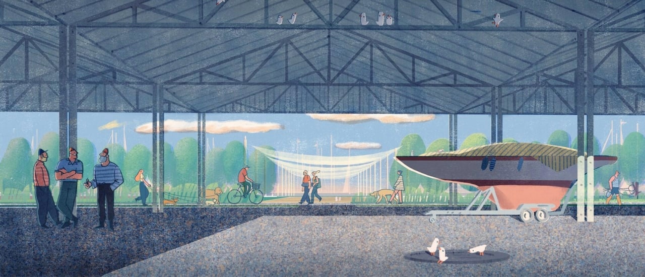 Проект предполагает, что в акватории Малой Невы появляются новые места стоянки яхт. У южной набережной строят нижний уровень, соединяющий понтоны с берегом. Площадь, которая сейчас используется для хранения лодок, перекрывается навесом. Как полагают архитекторы, в летнее время под ним можно было бы устраивать выставки и проводить лекции.