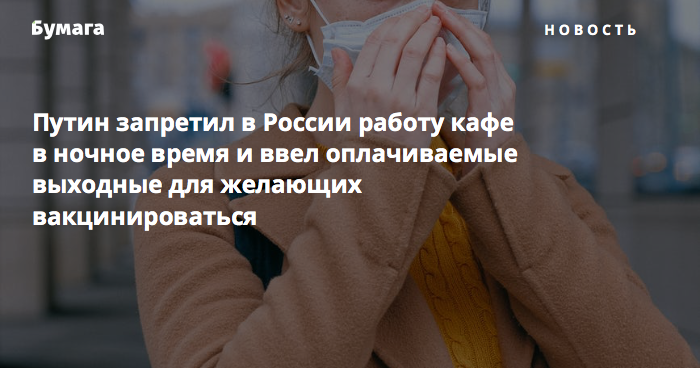Путин запретил в России работу кафе в ночное время и ввел оплачиваемые выходные для желающих вакцинироваться