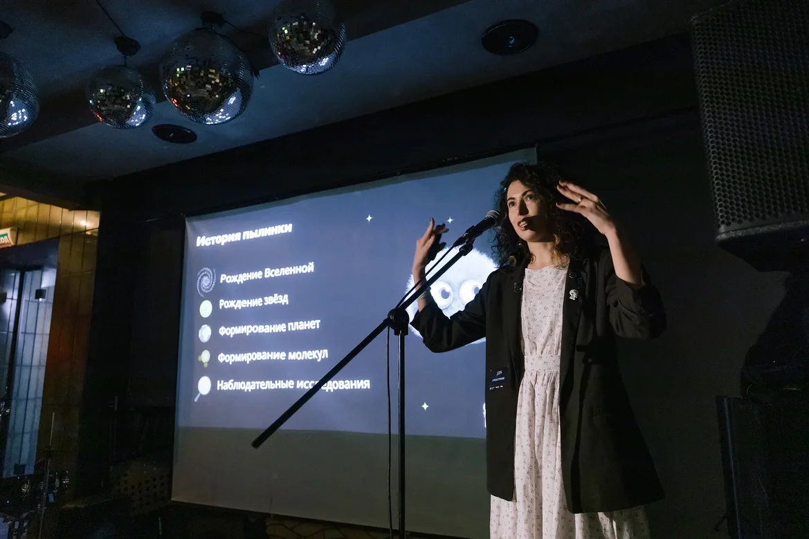 Выступления ученых начались в 19:00. На фестивале исследователи читали лекции о квантовом искусственном интеллекте, роли пыли во вселенной, витаминах и патологоанатомии.