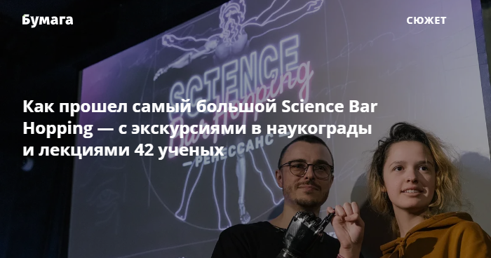 В воскресенье «Бумага» провела научный фестиваль Science Bar Hopping в Москве. Генеральным партнером стал мультимедийный сервис Okko. За один вечер 42 ученых в барах прочитали лекции о Средневековье, «воздушных такси», роли пыли во вселенной и мировой экономике во время пандемии.