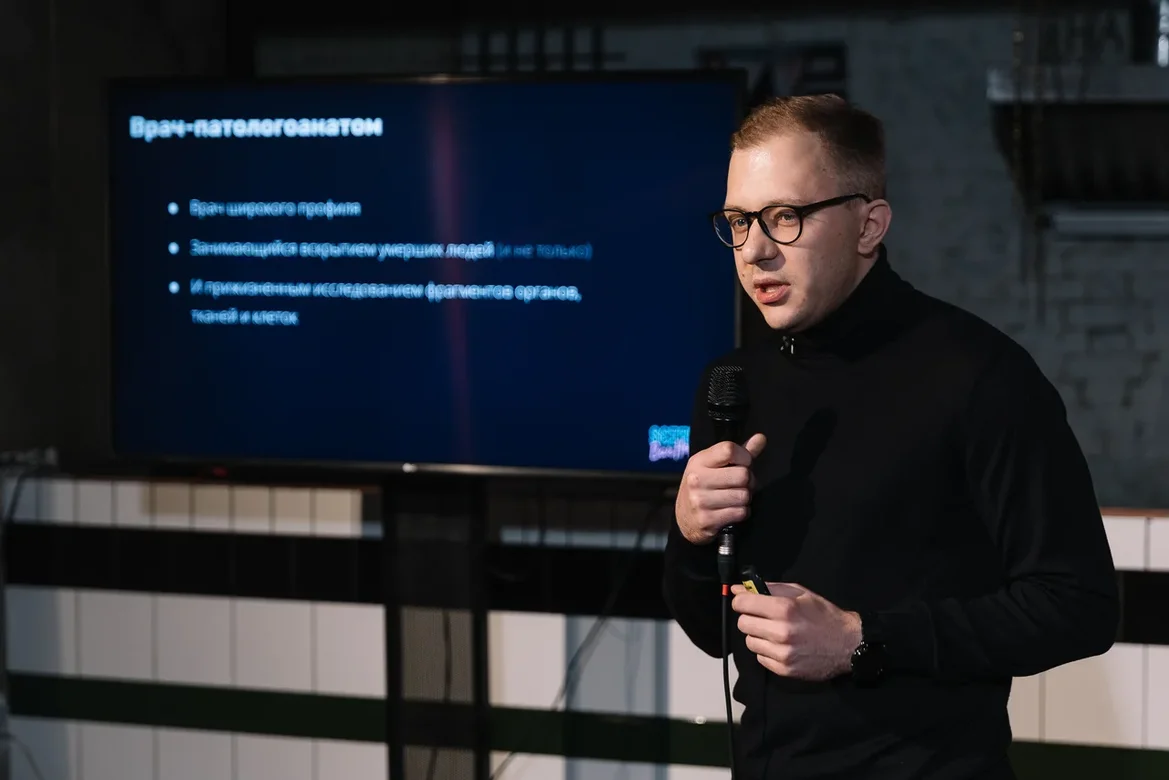 И еще одно фото — с выступления патологоанатома Егора Зарубина. На лекцию «Чему мертвые могут научить живых?» места закончились очень быстро. Зато вы можете почитать интервью с Егором Зарубиным о его работе, которое публиковала «Бумага».
