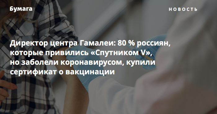 Директор центра Гамалеи: 80 % россиян, которые привились «Спутником V», но заболели коронавирусом, купили сертификат о вакцинации