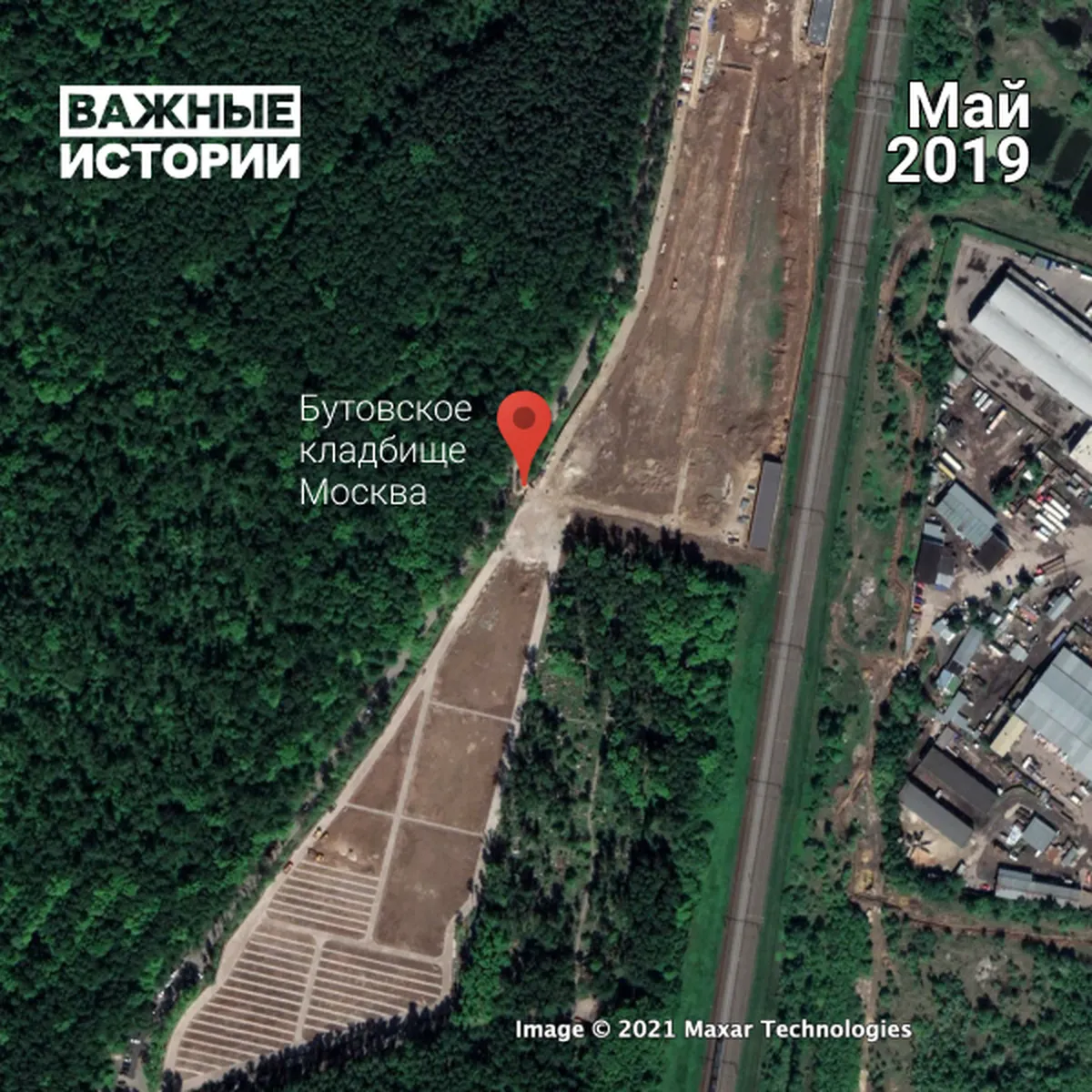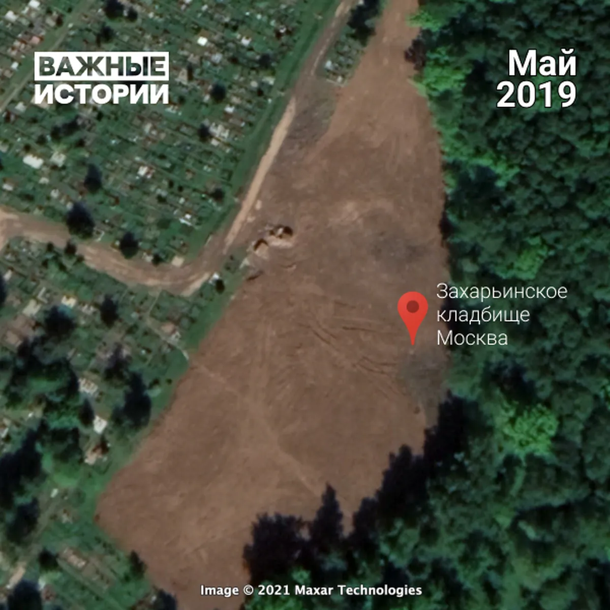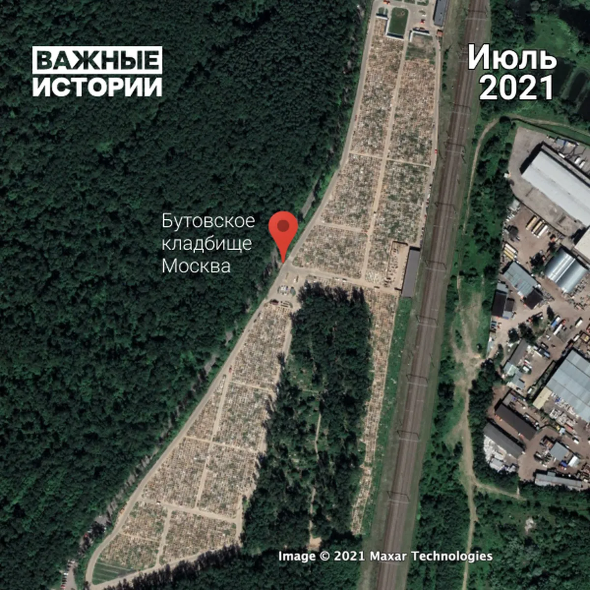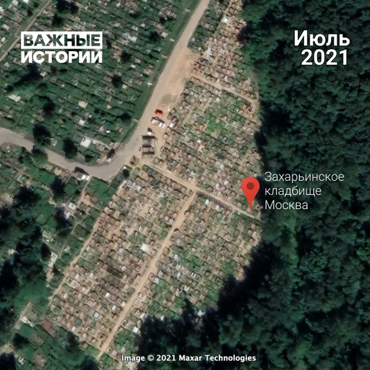 Кладбища в России заполняются стремительно. Например, это вид со спутника на новый участок Бутовского кладбища в Москве на 8 тысяч мест, открытый в январе 2020 года. Уже через год — летом 2021-го — на нем почти не осталось свободных мест. То же произошло с новым участком Захарьинского кладбища, открытым в 2020-м