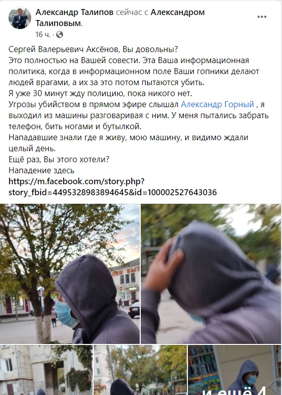 Александр Горный разделяет мнение Александра Талипова, что нападение на него является «личной ответственностью» Сергея Аксенова и его команды, отвечающей за информационную политику в регионе.