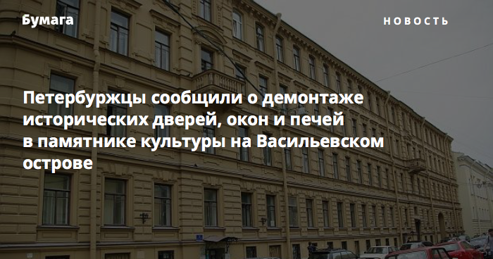 Петербуржцы сообщили о демонтаже исторических дверей, окон и печей в памятнике культуры на Васильевском острове