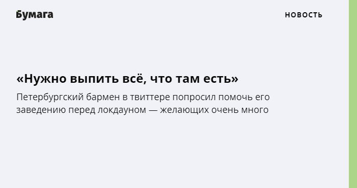 Сотрудник петербургского бара «Диего жжет» попросил горожан помочь его заведению перед локдауном. «В четверг и пятницу нужно выпить вообще всё, что там есть», — написал он в твиттере. Желающих оказалось много — за сутки пост набрал более 6 тысяч лайков и 1,5 тысячи репостов.