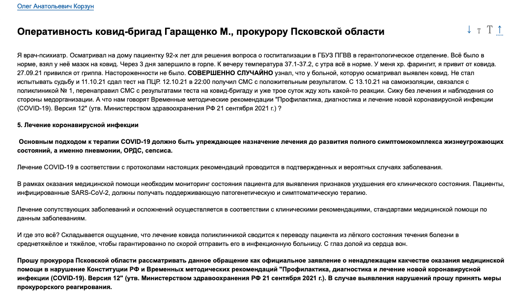 Напомним, псковский врач-психиатр Олег Корзун обратился к председателю комитета по здравоохранению Псковской области Марине Гаращенко и прокурору Псковской области Ивану Грибову с просьбой проверить качество оказания медицинской помощи больным коронавирусом в Пскове и регионе: своё обращение, которое он просит считать официальным заявлением, он опубликовал на сайте губернатора.