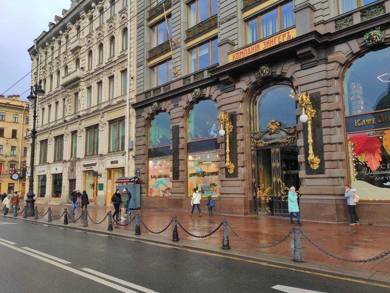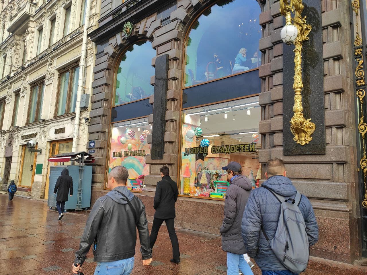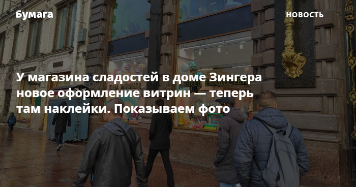Владелец сети магазинов сладостей Михаил Ветров рассказал «Бумаге», что оформление временное — на стеклах сейчас наклейки. Они выполнены в стилистике вывески кафе «Зингер».