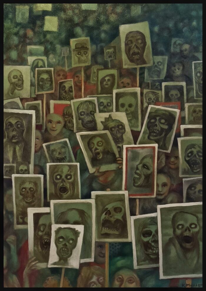 В сентябре в помещении петербургского объединения «Свиное рыло» показали картину «Живые и мертвые» художника Кирилла Миллера, на которой изображены люди, несущие таблички с черепами. В соцсетях объединения произведение назвали «Нетленный полк 2». В патриотических пабликах оскорбились из-за ошибочного названия, увидев в нем аллюзию на «Бессмертный полк».