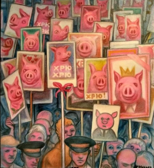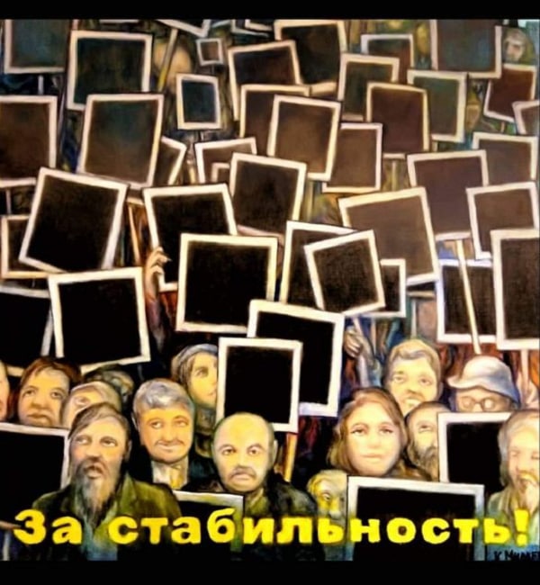 Я бы не сказал, что это картина входит в некую серию, она является частью всего моего творчества. Всё началось примерно в 1980-е годы. Вот совсем недавно я нашел каталог того времени, где представлена моя картина, на которой два человека тоже держат на палках портреты друг друга и как бы перечеркивают друг друга. То есть ее смысл в том, что каждый из них пытается друг друга запретить. Кроме этого, была новогодняя картина, посвященная году Свиньи: на ней люди несут на палках портреты свиней с надписью «Хрю-хрю». Или еще одна картина, где люди несут на палках картину Казимира Малевича «Черный квадрат» с надписью «Стабильность».