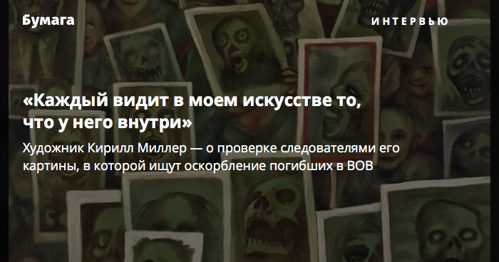 Всё это было размещено в сообществе «Воспоминания ветеранов», именно оттуда всё пошло. Оно же, насколько я понимаю, пыталось подключить к этой ситуации организаторов «Бессмертного полка», что в результате у них и вышло. В итоге Следственный комитет РФ был завален заявлениями по поводу моей картины. (В октябре этого года на странице организаторов «Бессмертного полка» в фейсбуке появился пост, в котором говорилось об иске к петербургскому художнику, а также видео с заявлением адвоката и бывшего детского омбудсмена Павла Астахова, который сказал, что картина Кирилла Миллера пародирует патриотическую акцию и назвал ее «пляской на костях» — прим. «Бумаги»).