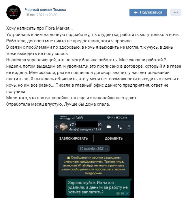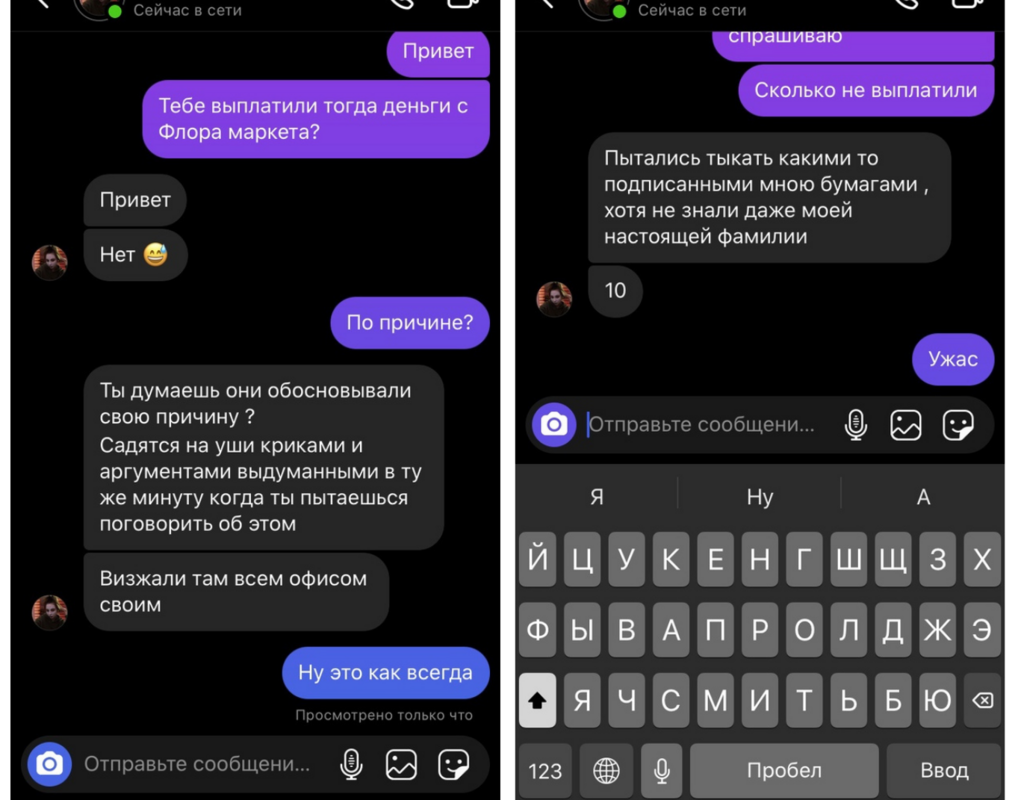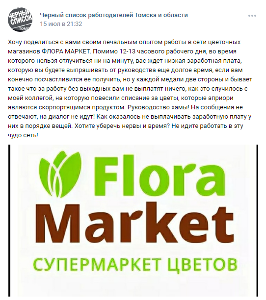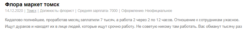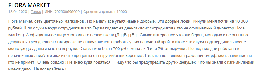 Мы связались с авторами некоторых из этих отзывов. Действительно, флористы «Flora Market» работают неофициально (мы поговорили с пятью бывшими сотрудниками — официального трудоустройства не было ни у них, них у их коллег). Никто не подписывает трудовые договоры. Во-вторых, каждый из них сталкивался с постоянными задержками зарплаты и не получал обещанную сумму. Были проблемы и с выплатой денег после решения об увольнении.