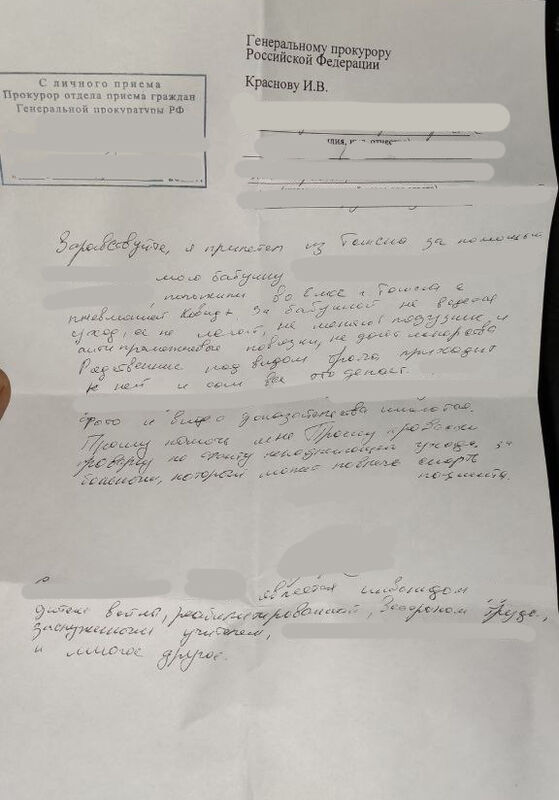 В Генпрокуратуре России заявление у него тоже приняли (имеется в распоряжении редакции ТВ2). В заявлении С. написал, что за «бабушкой не ведется уход, ее не лечат, не меняют подгузник и противопролежневые повязки, не дают лекарства. Родственник под видом врача приходит к ней и сам все это делает. Прошу помочь мне. Прошу провести проверку по факту ненадлежащего ухода за больным».
