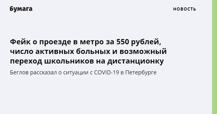 Фейк о том, что проезд будет стоить 550 рублей. Александр Беглов сообщил, что власти планируют обратиться в полицию из-за публикации сатирического издания «Панорама» (в ней говорилось, что проезд в метро Петербурга во время локдауна будет стоить 550 рублей). «Мы по таким слухам будем обращаться в силовые структуры, это не просто шутки или анекдот. Когда распространяются слухи, которые приводят к панике, это преступление», — сказал глава города.