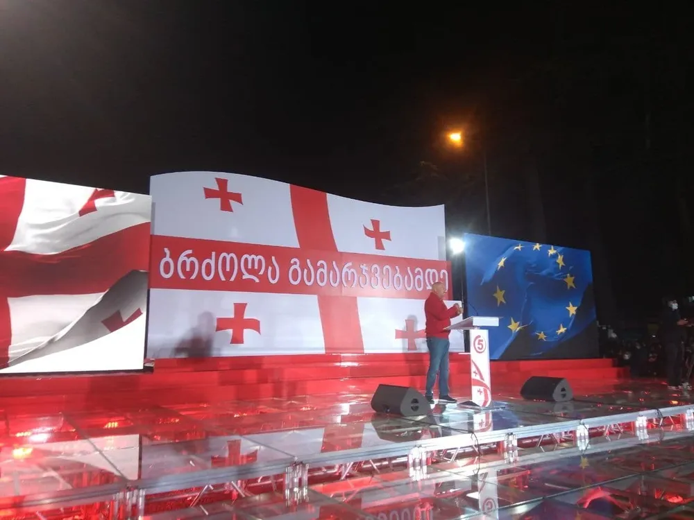 Еще днем площадь напротив мэрии Зугдиди стали огораживать и возводить там сцену. К 20.30, времени начала акции, она была заполнена людьми под завязку. Многие пришли с бело-красными грузинскими флагами, некоторые — с белыми с изображением Миши и надписью «Free Saakashvili». За сценой огромный флаг Грузии соседствовал с портретами политика, флагом Евросоюза и цифрой 5 — под ней нацдвижение фигурирует в бюллетене.