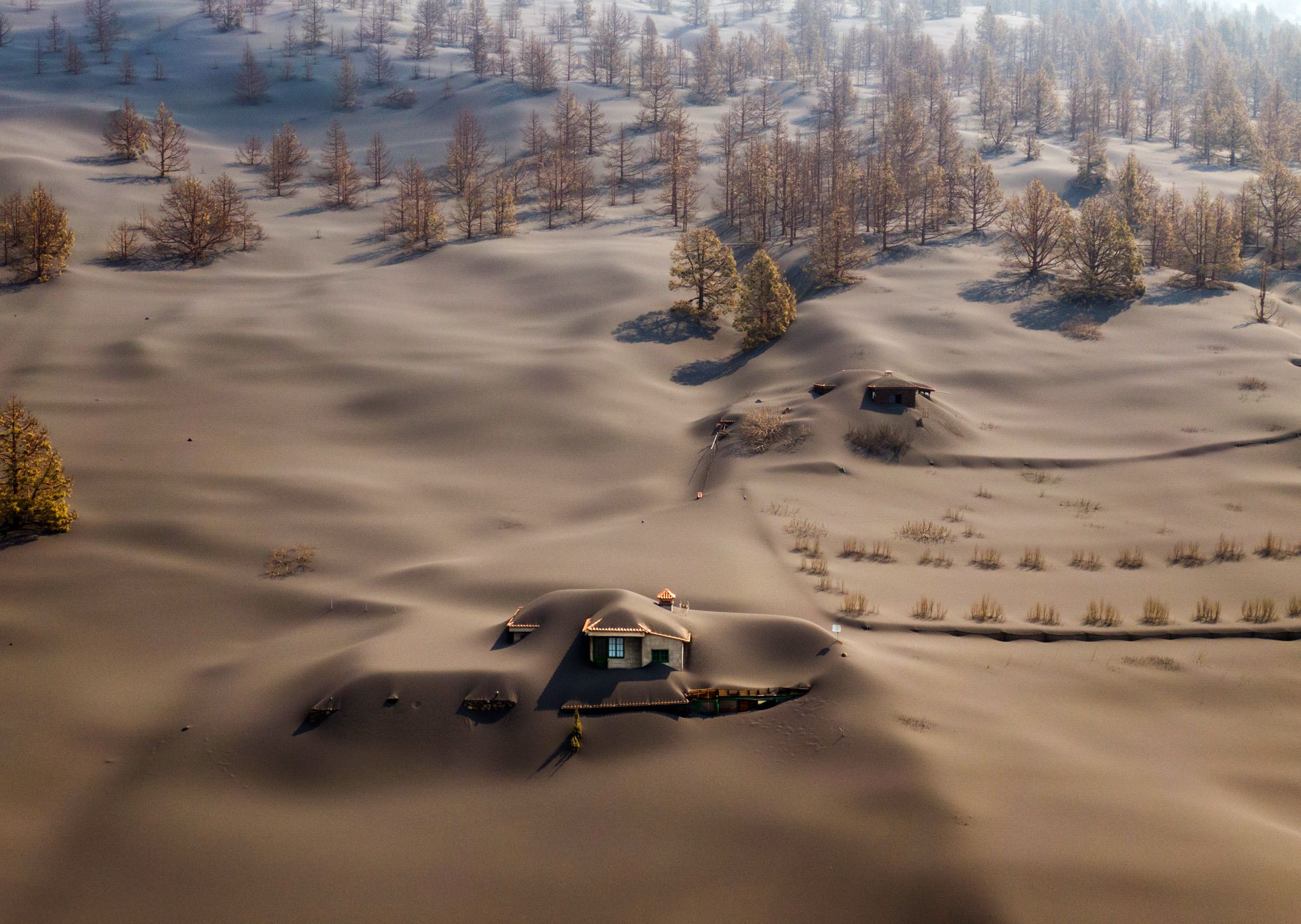 Пепел от извергающегося вулкана на Канарских островах покрыл дома и деревья. Фотография