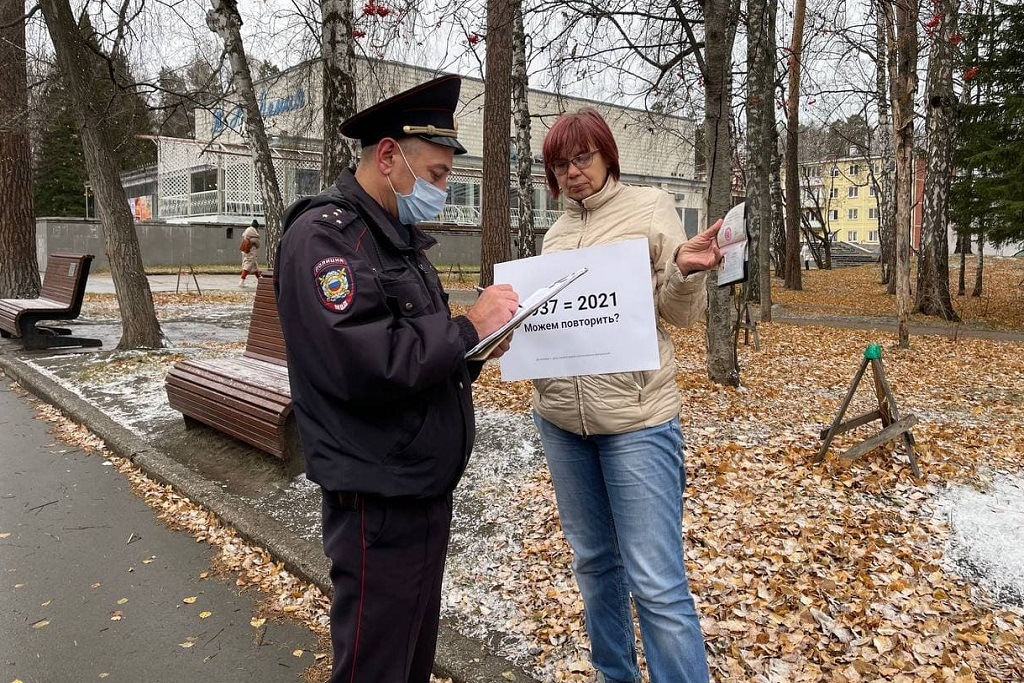 Позже на Ильича с плакатом «Пытки запрещены законом?» вышел мужчина. На пикет также вышла независимая депутатка новосибирского горсовета Светлана Каверзина. К ней тоже подошел сотрудник полиции вместе с женщиной в черной одежде и с видеокамерой.