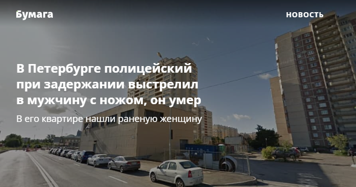 В Пушкинском районе полицейский после предупредительного выстрела застрелил мужчину с ножом. Об этом «Бумаге» сообщили в пресс-службе ГУ МВД по Петербургу и Ленобласти.